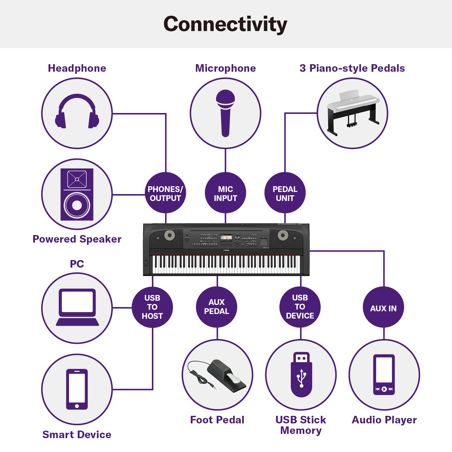 Add the DGX-670 furniture stand (L-300) and piano-style pedal (LP-1) for an even more comfortable piano playing experience.